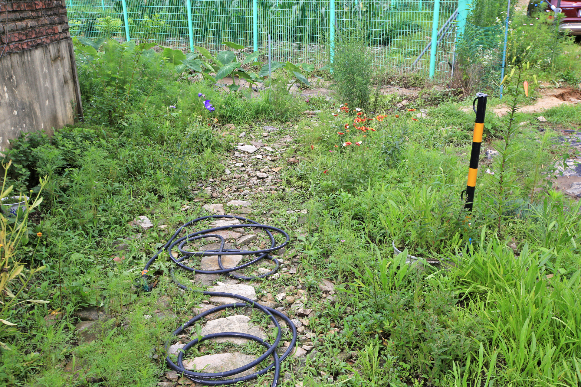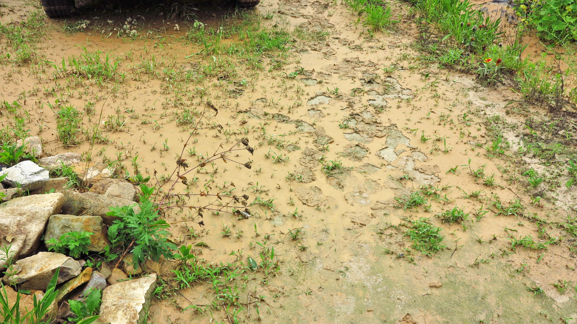 상류의 김S구네 밭둑이 터지며 흙탕물이 많이 내려왔다. 제때 배수가 되지 않으니 얕은 곳에 고여 있다가 진흙은 가라앉고 윗물만 배수된 것이다. 자갈을 깔은 통로 부분에 쌓인 진흙은 물호스를 이용하여 진흙을 씻어냈다.
