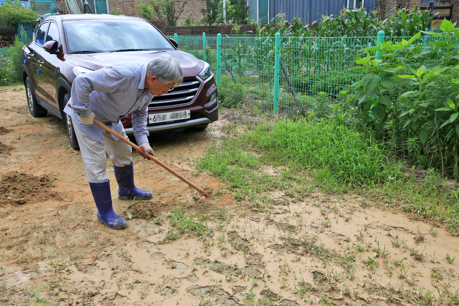 동네 산책을 마치고 식빵으로 요기한 다음에 바로 수해 복구 작업을 시작하였다. 어제 완료하지 못한 앞밭 통로의 진흙 제거 작업부터 시작하였다.