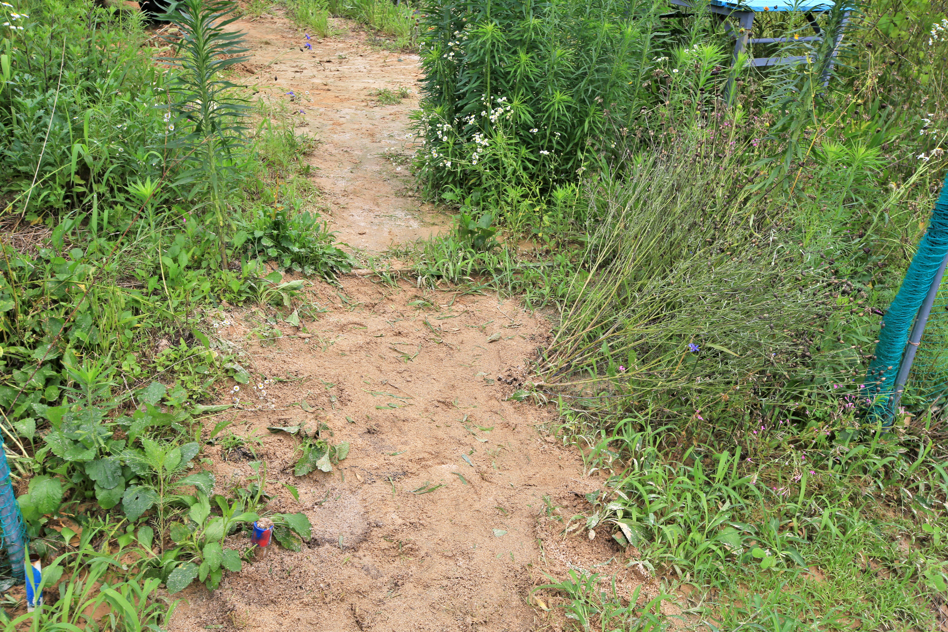 통로로 흘러내린 물에 흙이 유실되어서 작은 웅덩이가 생겼기에 흙을 채워서 메웠다.