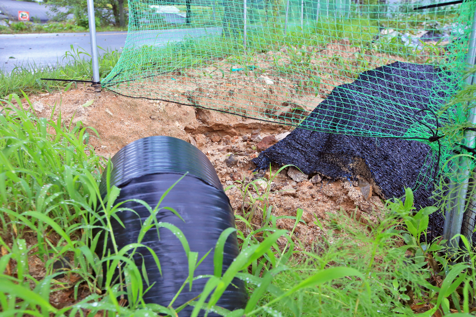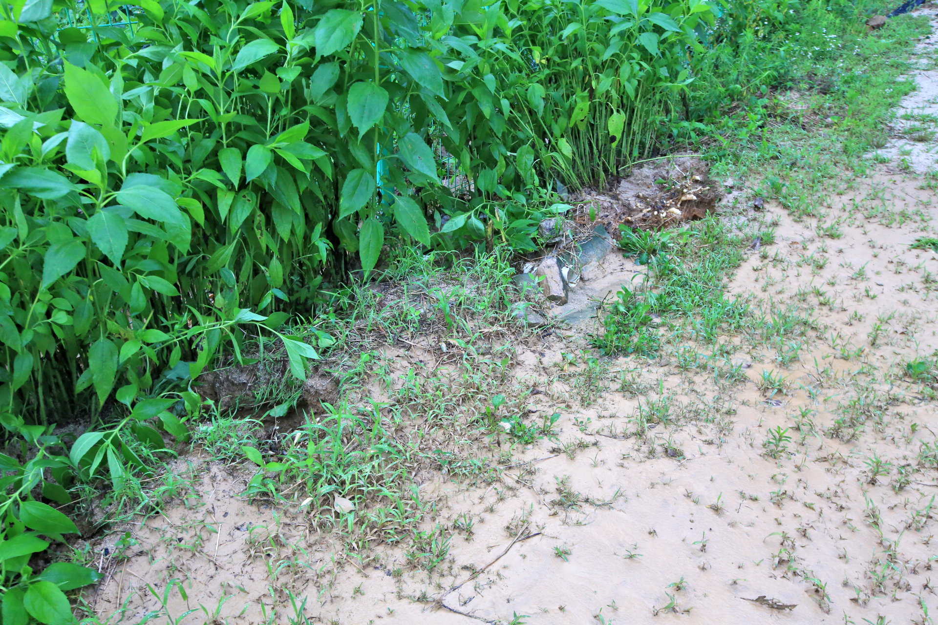 이웃 밭의 배수구 연결 부분의 흙이 유실되며 흙탕물이 통로로 흘러서 진흙이 쌓였다.