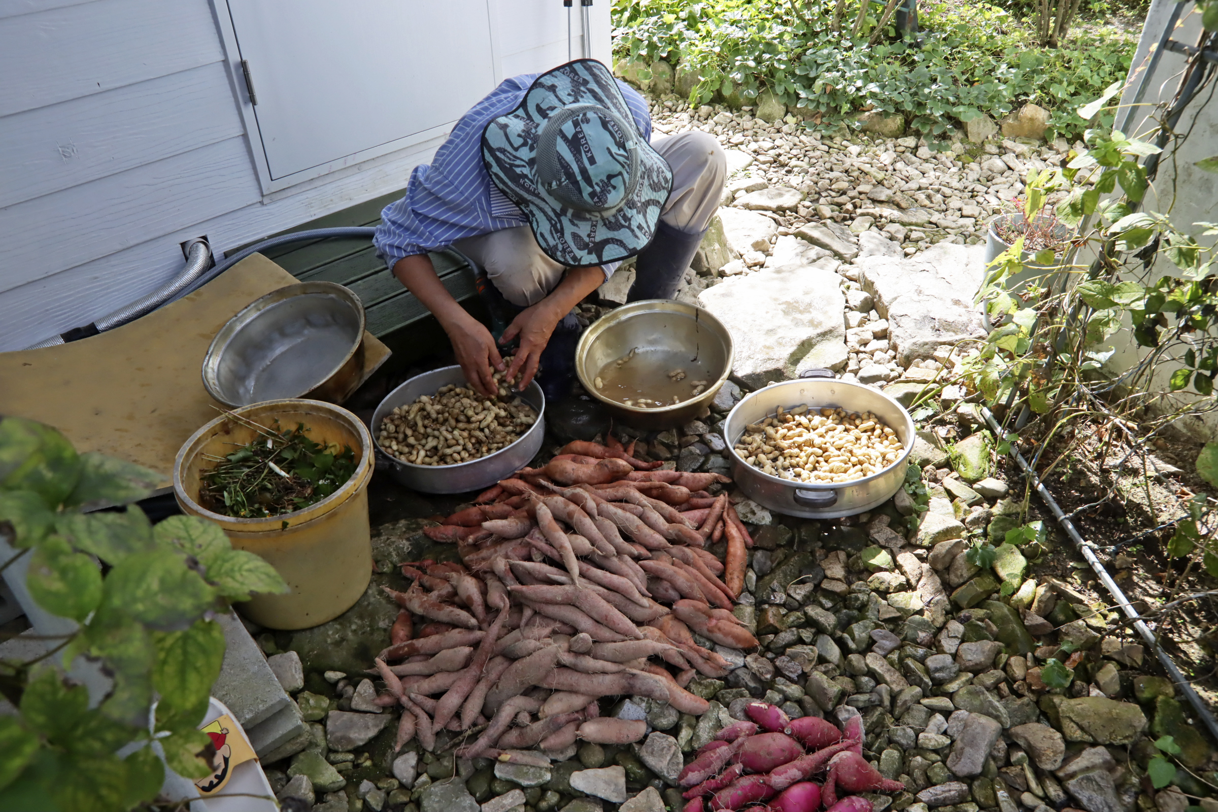 기운 좋은 딸이 오기를 기다려서 고구마와 땅콩을 캤다.