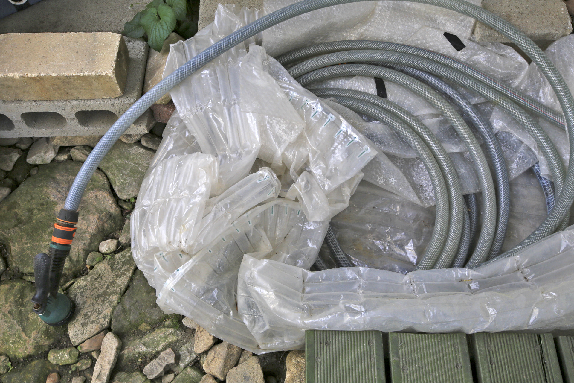 전번에 샤워실 동파방지용 뽁뽁이를 모두 제거하지 않았었다, 기온이 영하로 떨어지는 날이 자주 있어서 야외에 내놓은 물뿌리개용 호스가 얼지 않도록 뽁뽁이로 감싸 놓았었다. 설마 이제는 괜찮겠지 하는 생각이 들어서 샤워실 및 호스를 감싸주었던 뽁뽁이를 제거하였다.