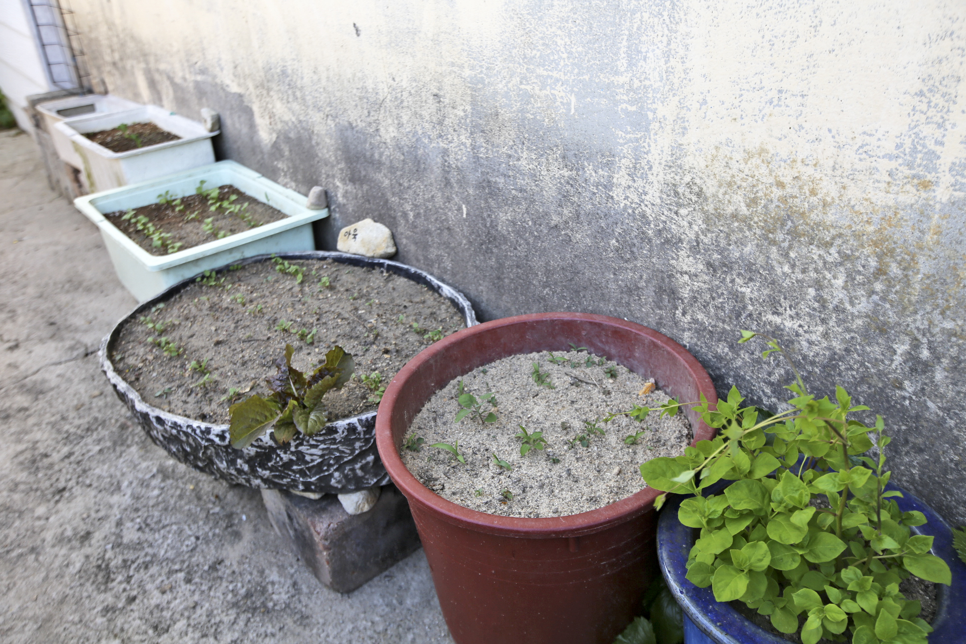 며칠 전 딸이 왔을 때 파종 한 완두+아욱+레디쉬가 싹이 돋아났다.