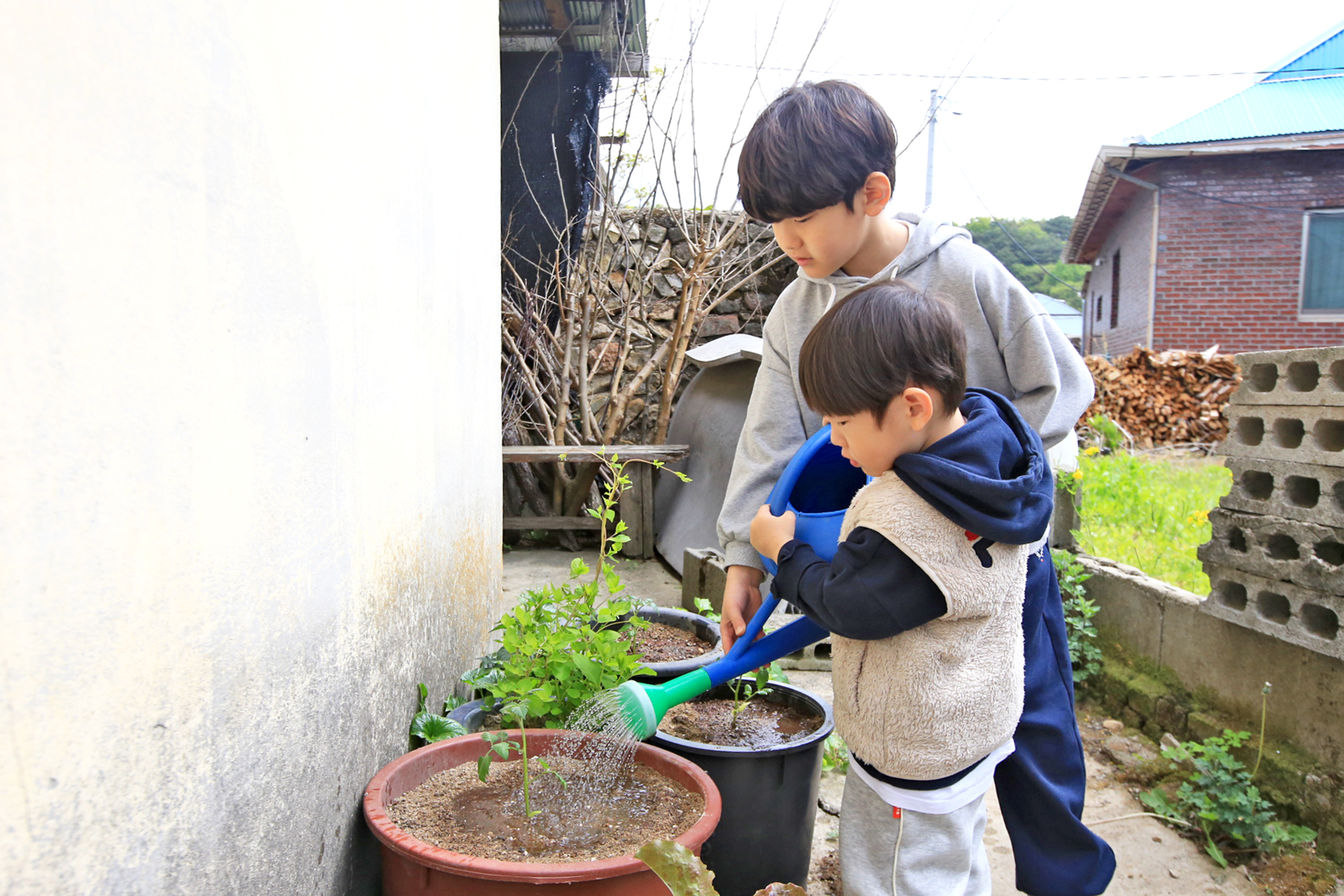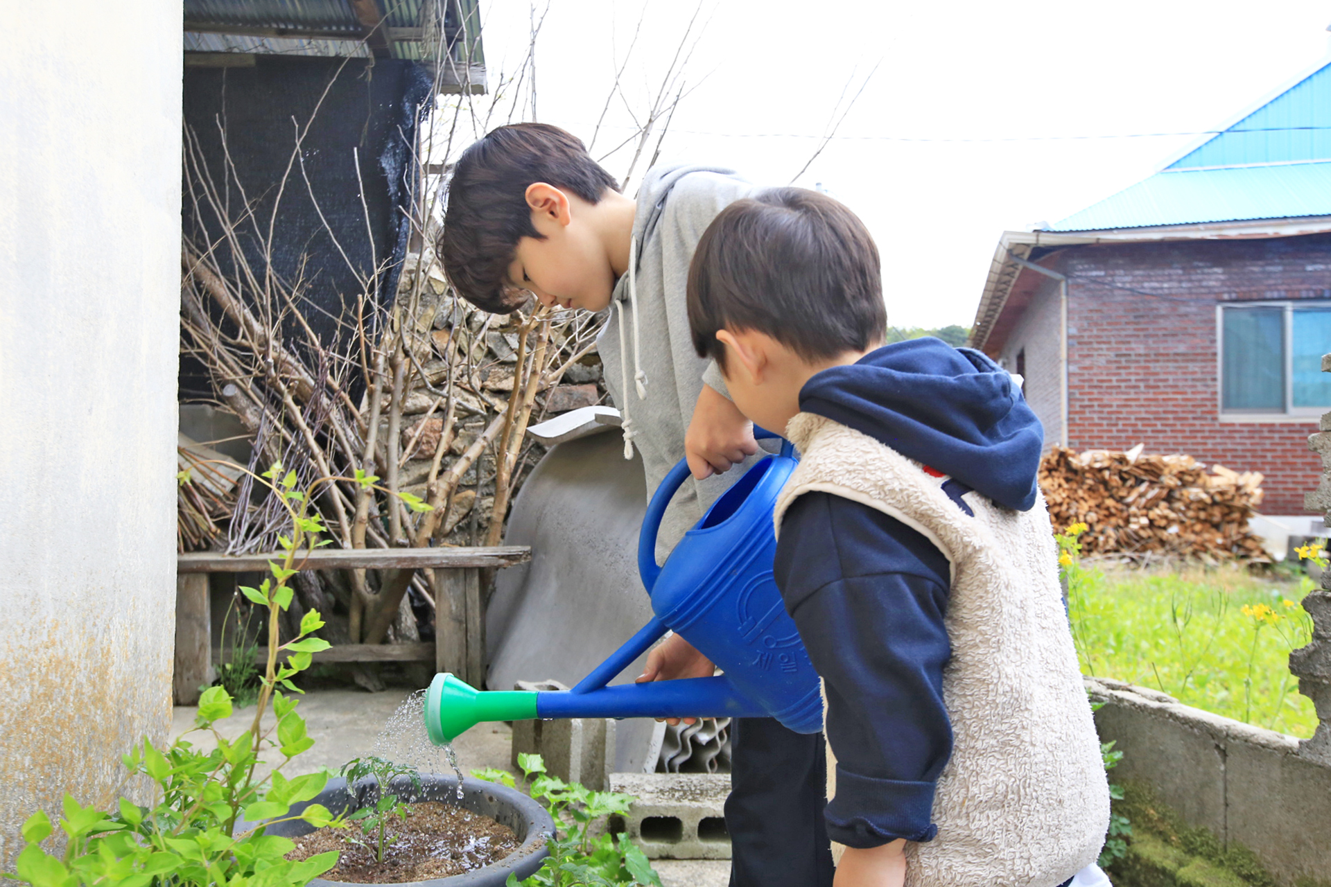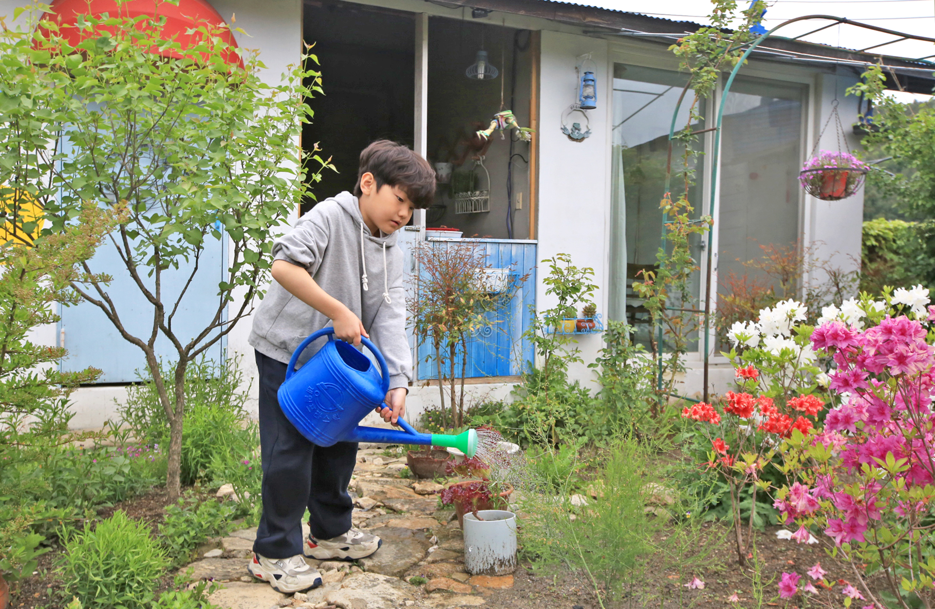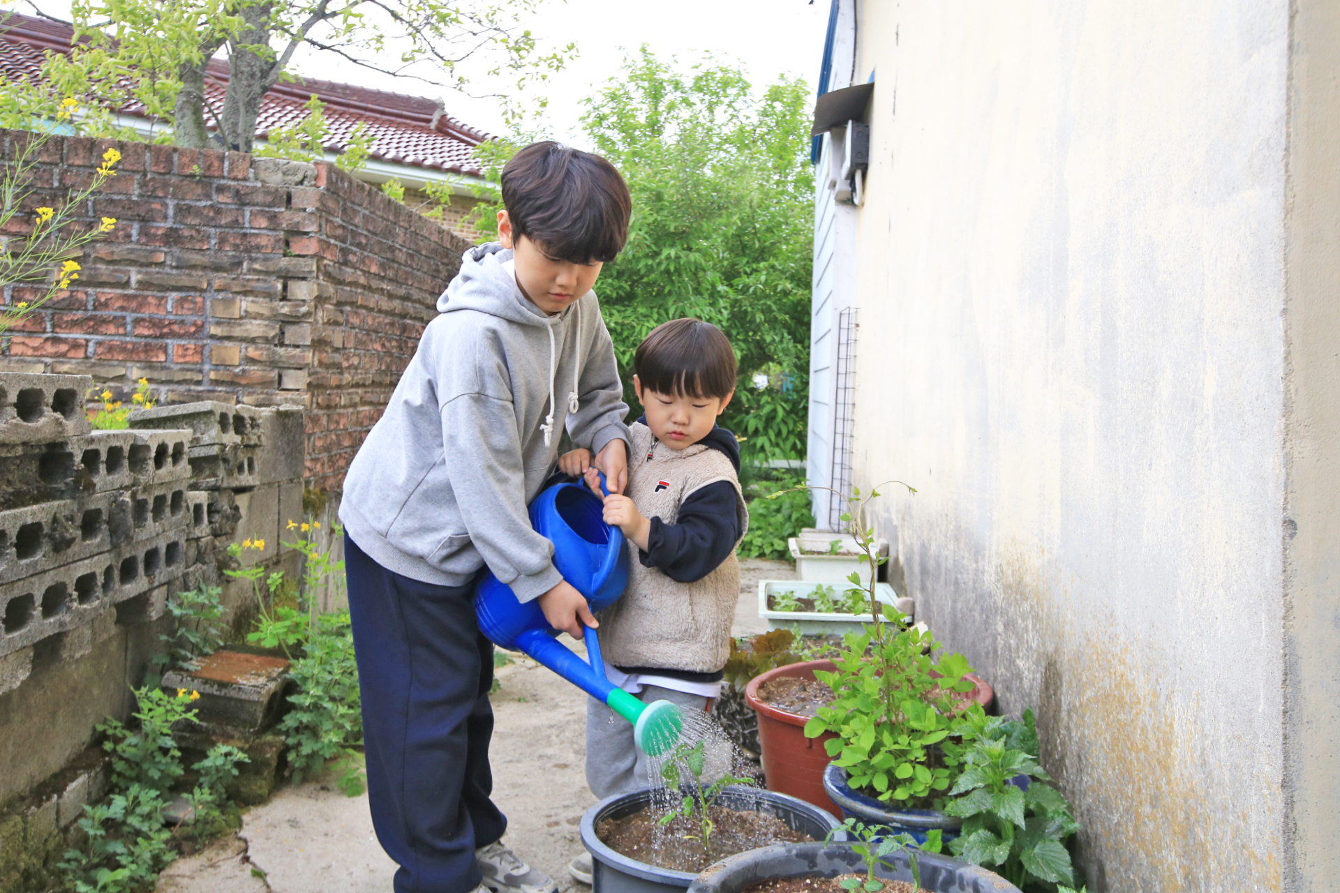 일부러 시키는 것이 아닌데 스스로 알아서 상추 화분에 물도 주고....