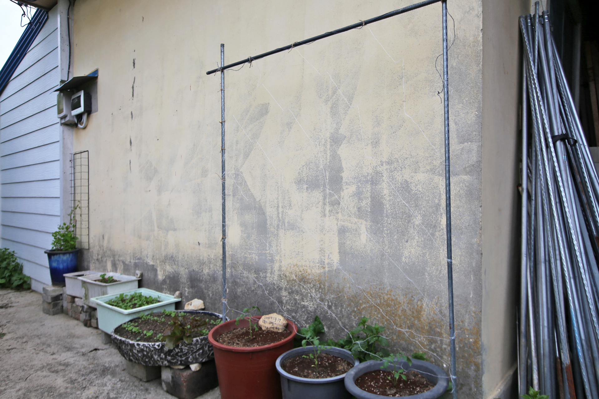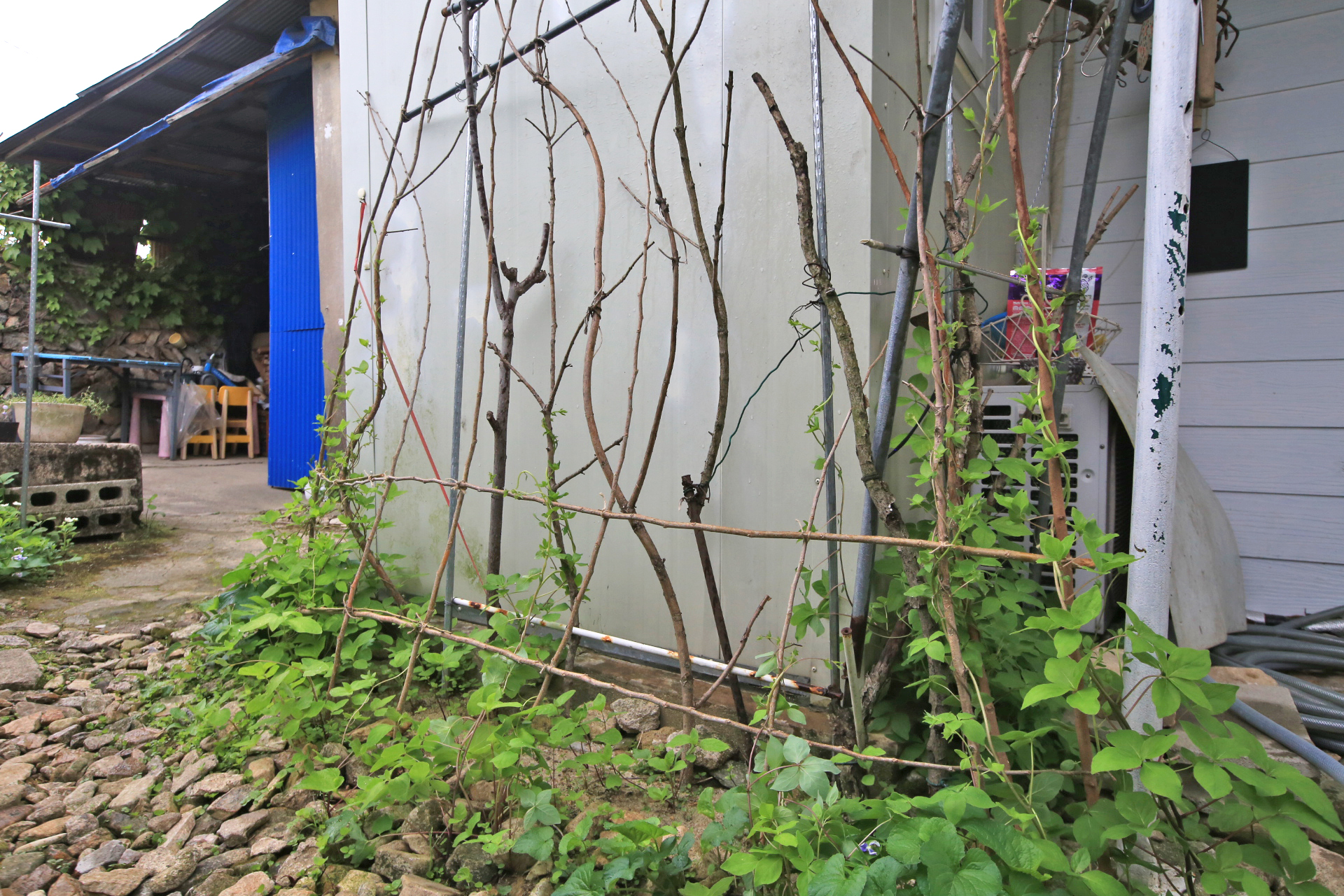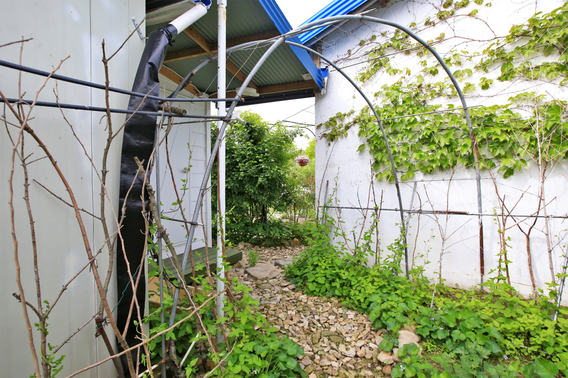 샤워실 지붕의 우수를 선홈통 없이 흘려보냈더니 물이 떨어지는 부분에 심은 더덕이 영향을 받는다. 선홈통 대신에 농업용 호스를 연결하였다.