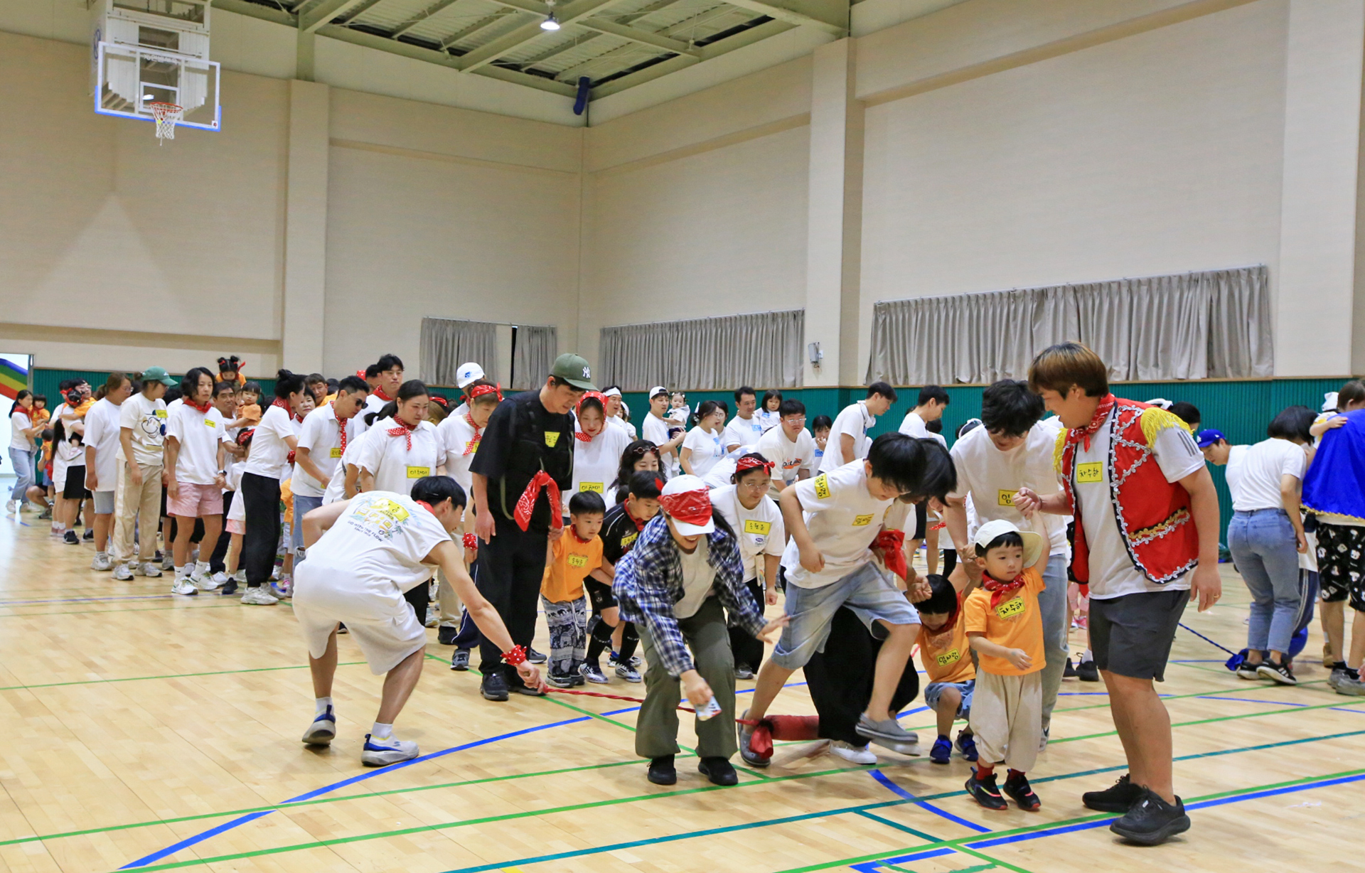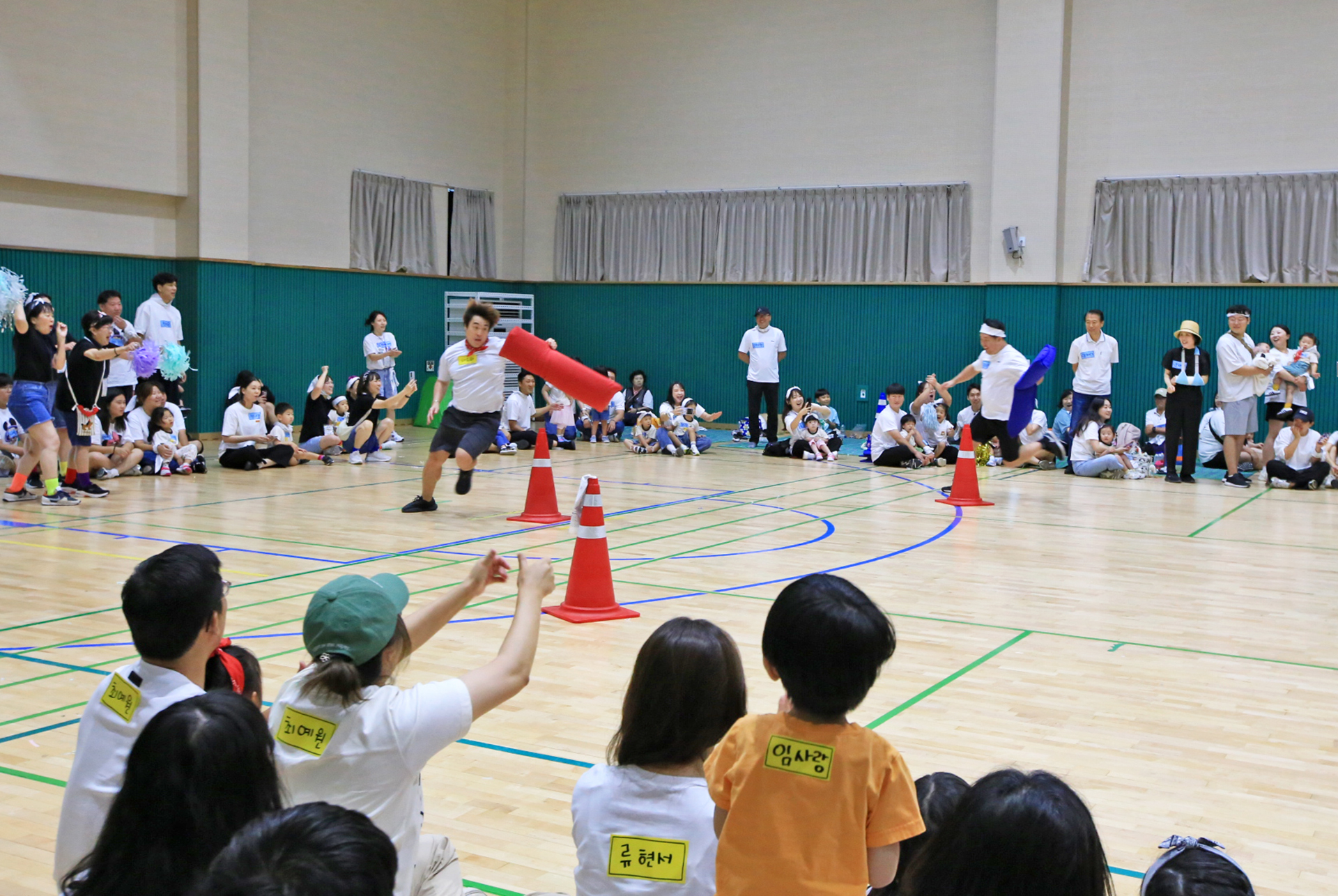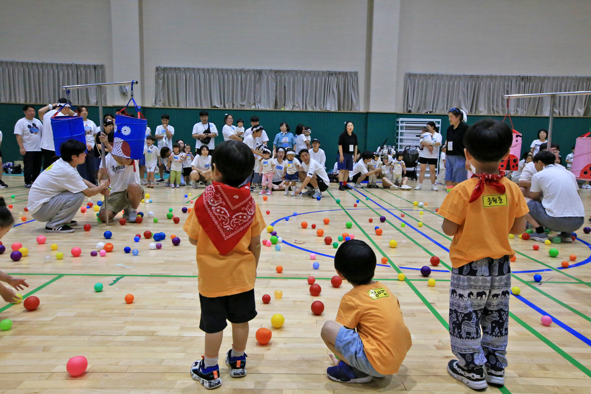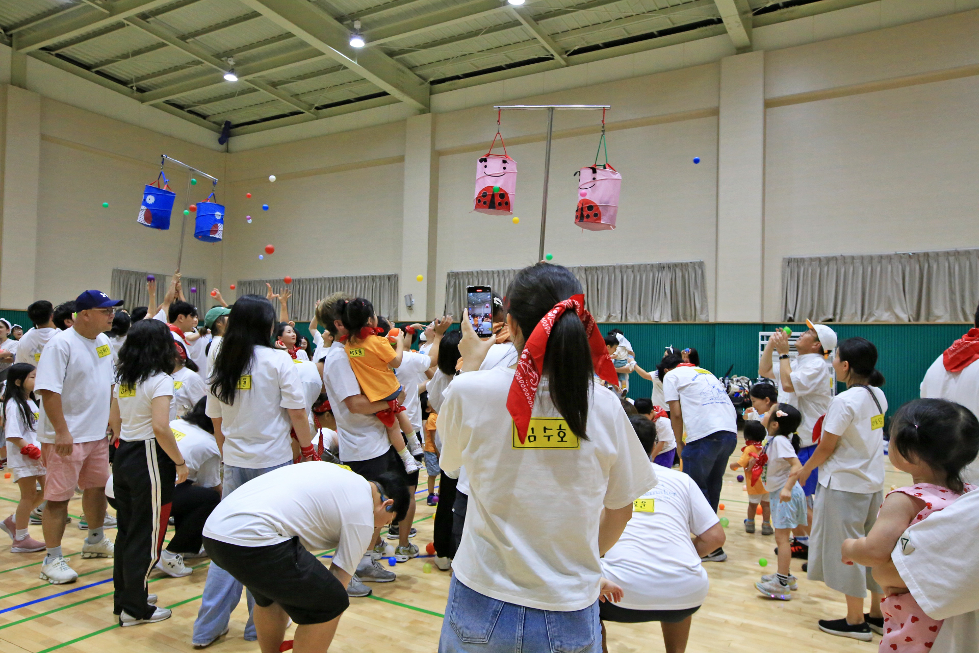 홍군 청군으로 나누어서 어린이들과 엄마들과 아빠들이 바구니 높이를 달리하며 공을 던져 넣었다.