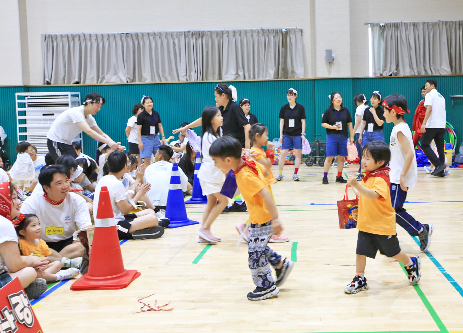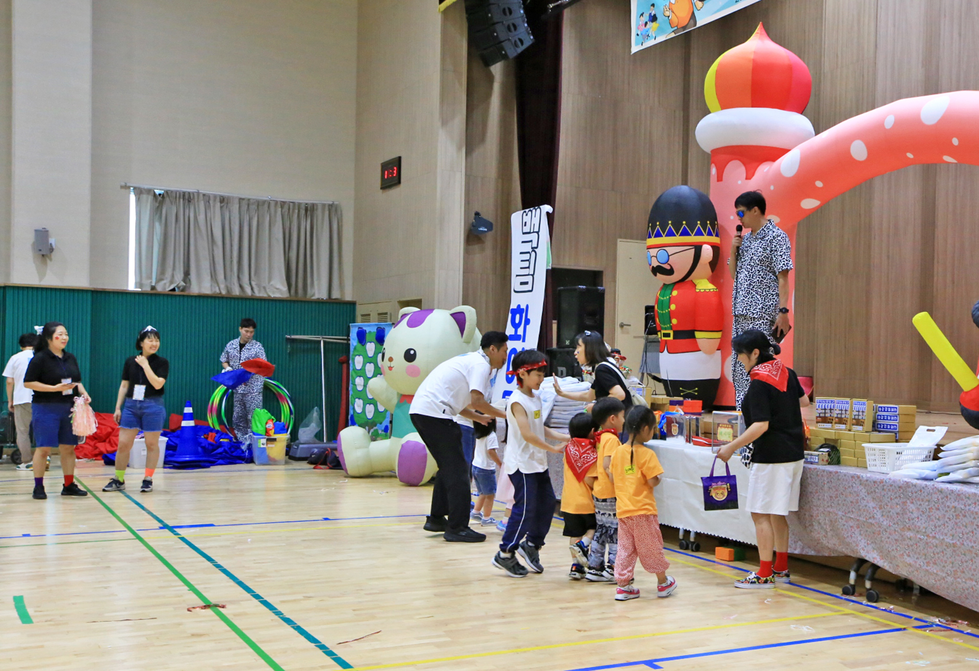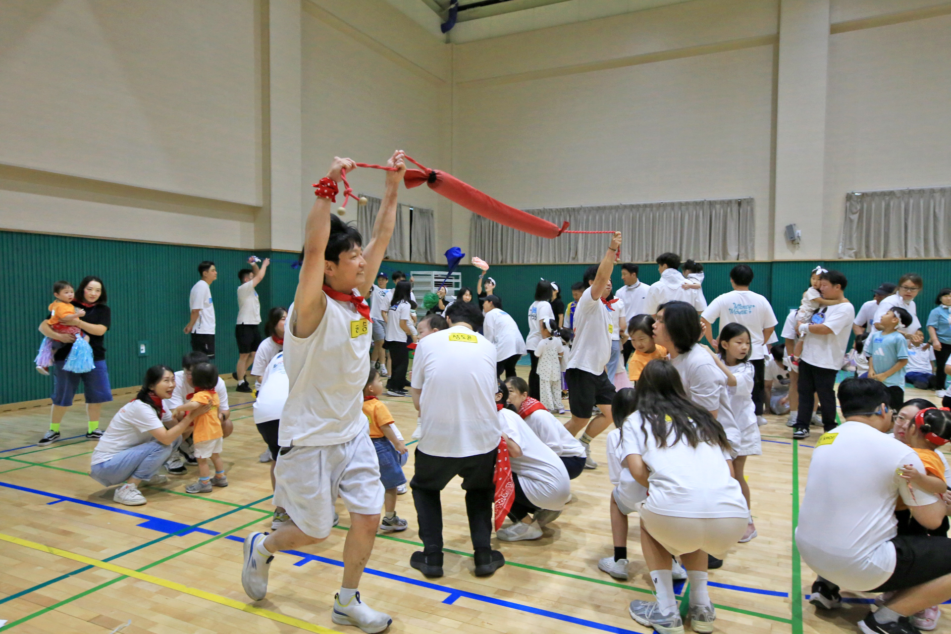 홍군 청군으로 나누어서 어린이들과 엄마들과 아빠들이 바구니 높이를 달리하며 공을 던져 넣었다.