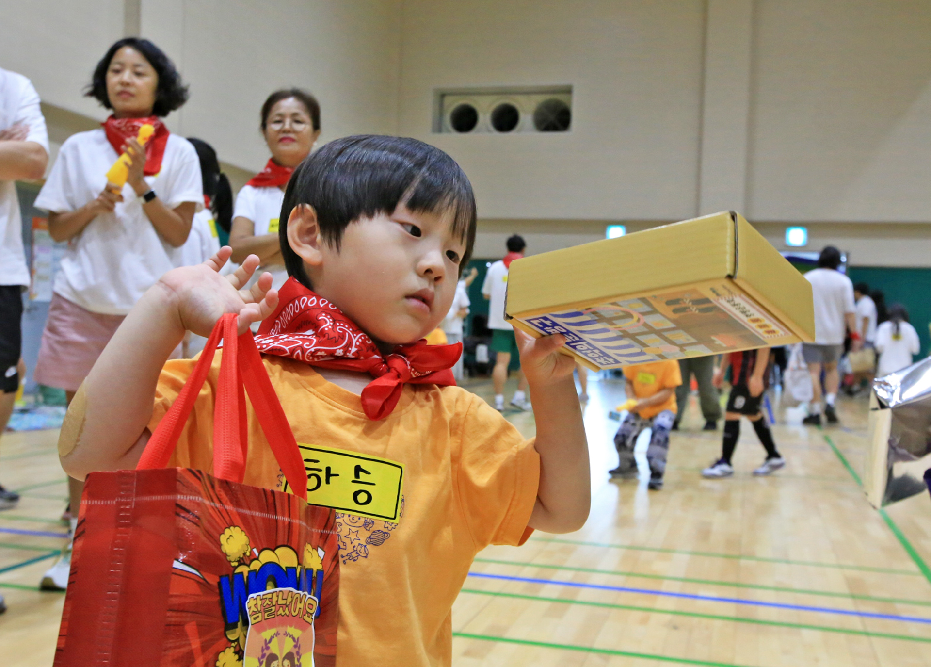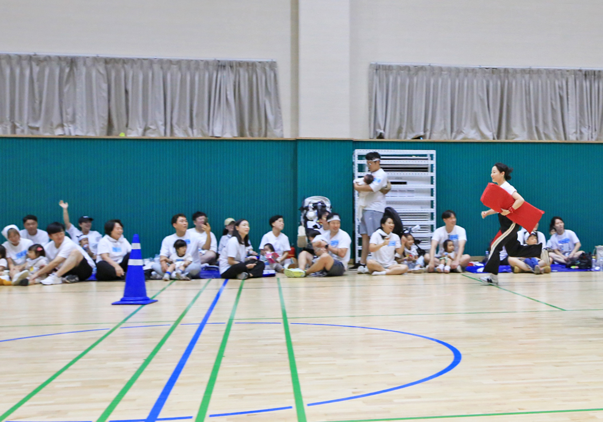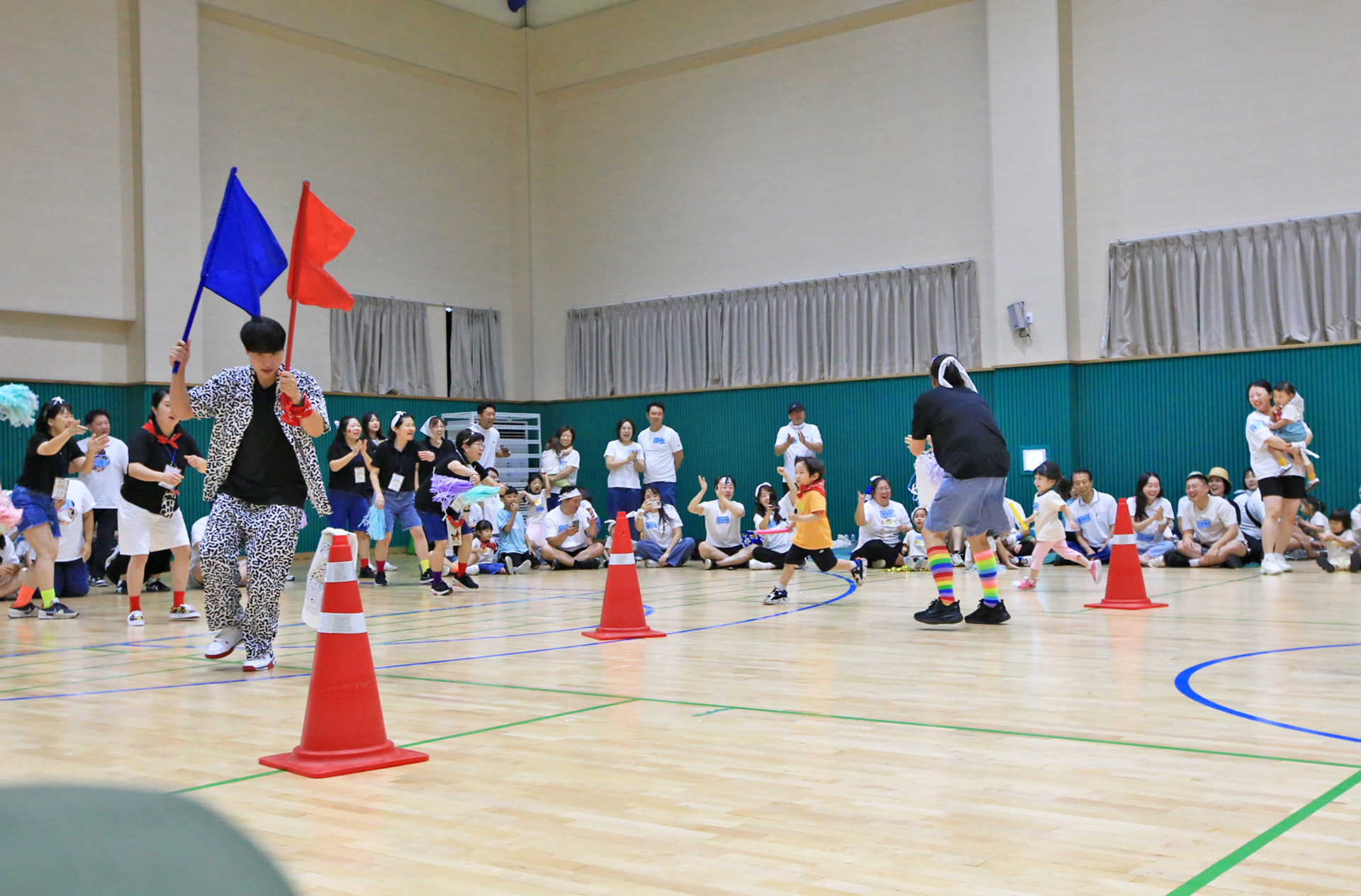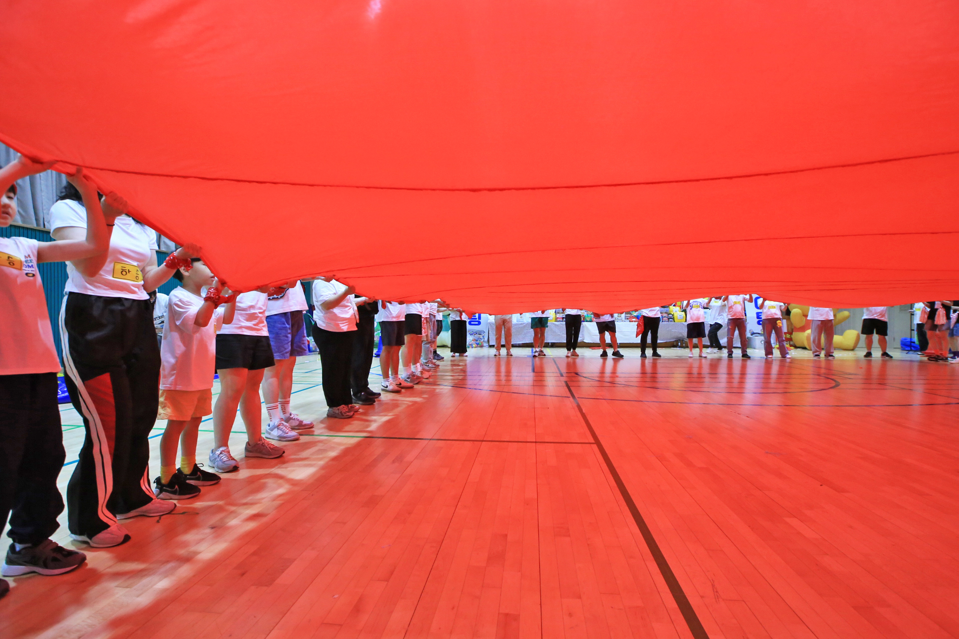 홍군 청군으로 나누어서 어린이들과 엄마들과 아빠들이 바구니 높이를 달리하며 공을 던져 넣었다.