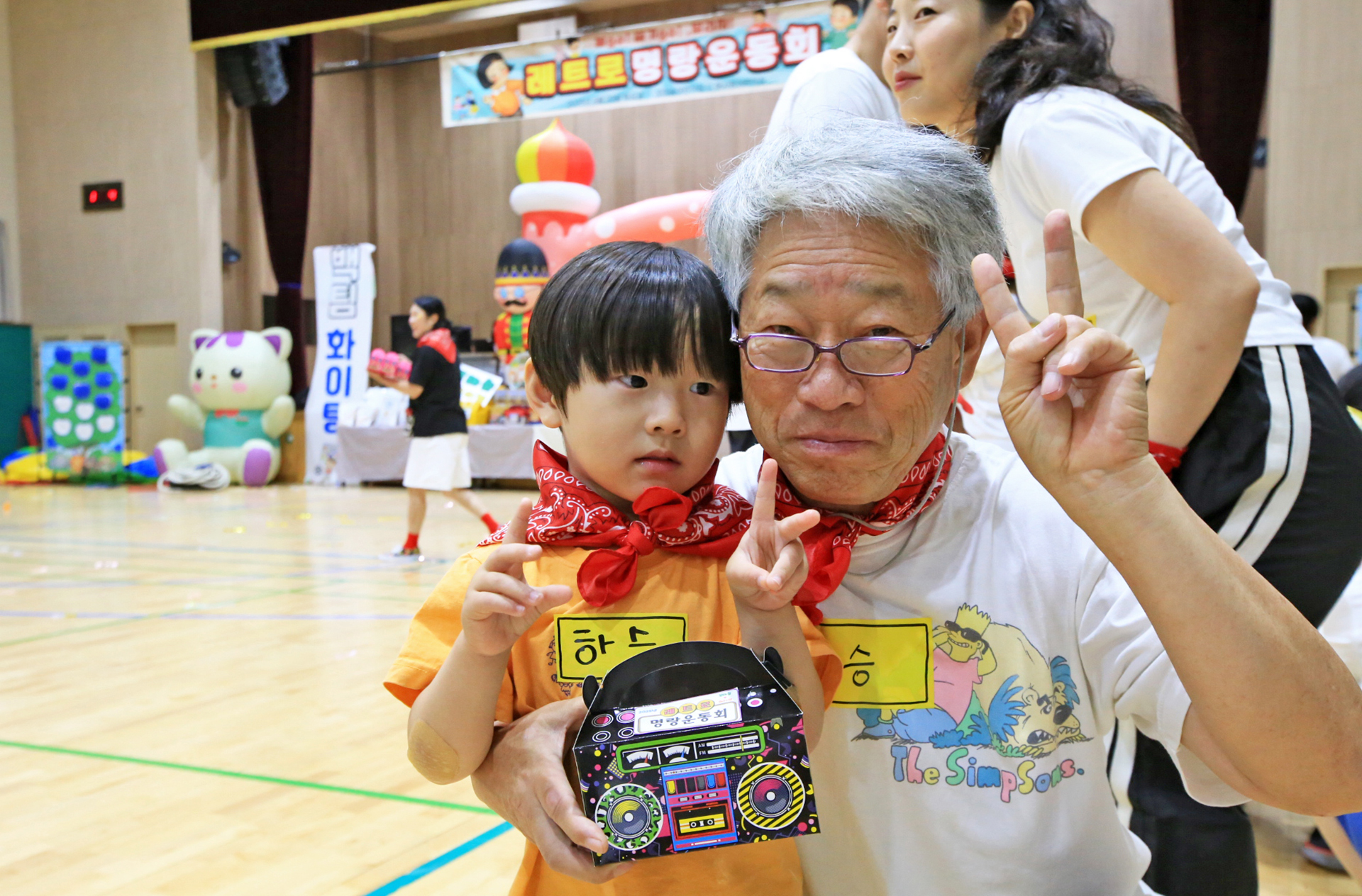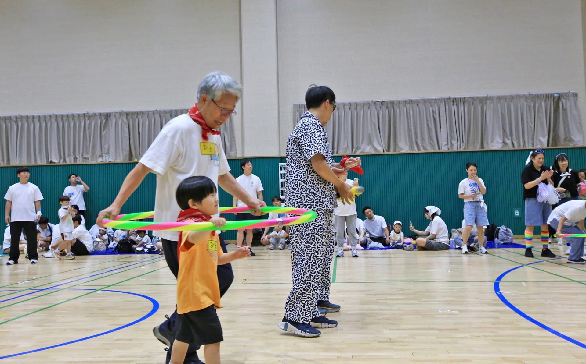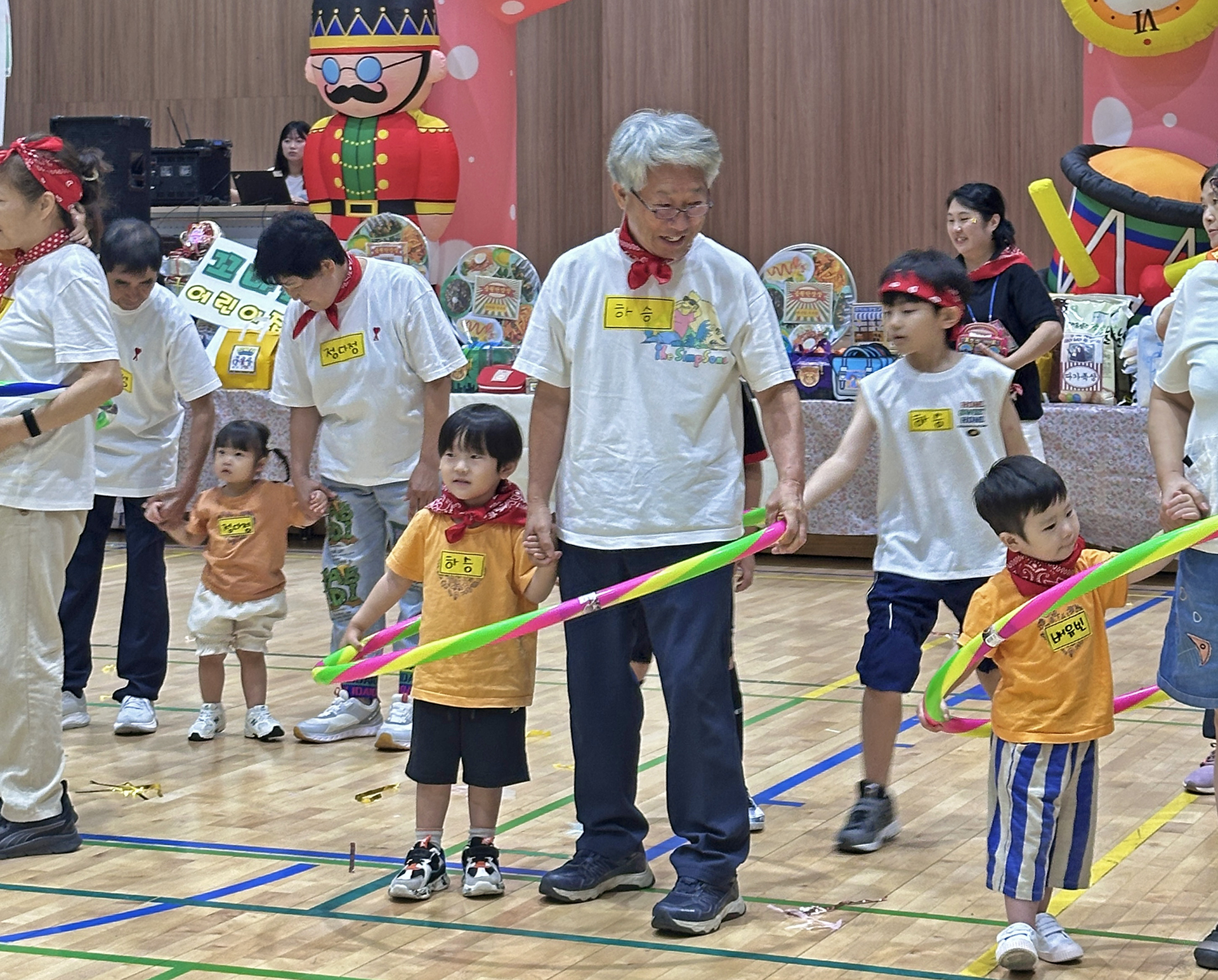 할머니 할아버지와 함께 훌라후프에 들어가서 반환점을 돌아오는 게임인데 반환점에서 율동도 해야 한다.
