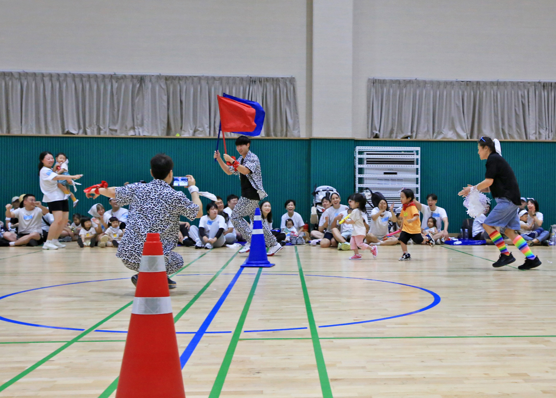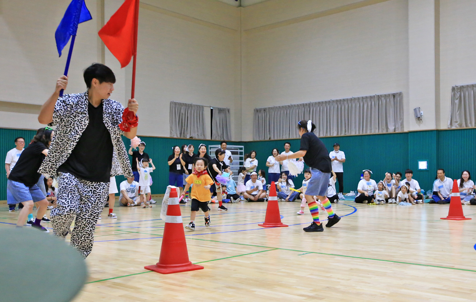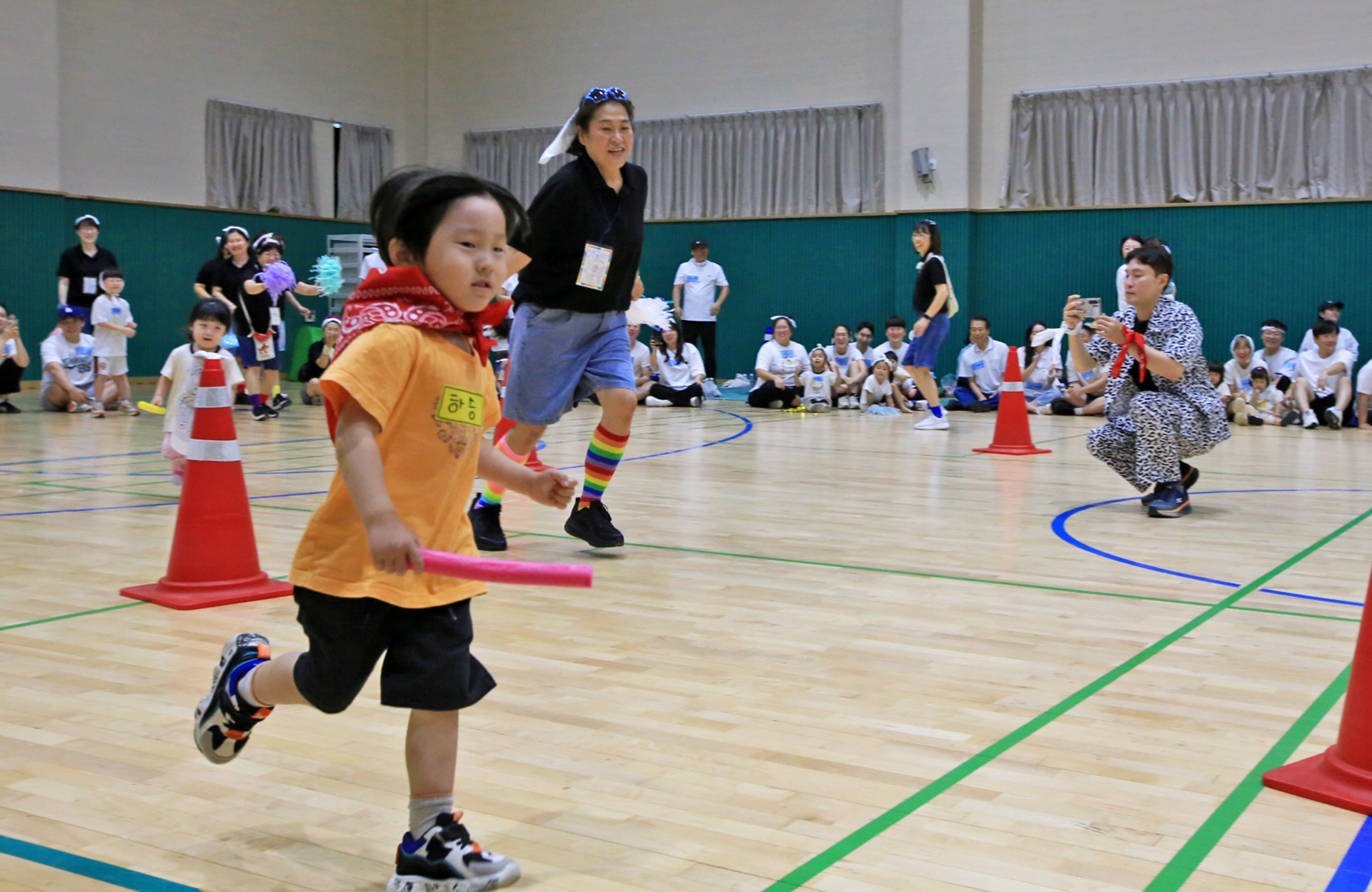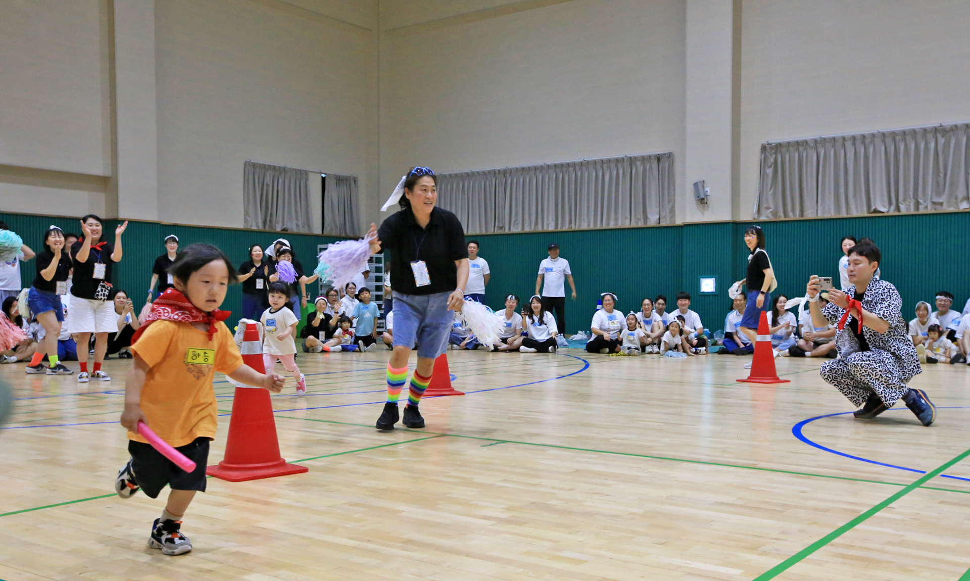 할머니 할아버지와 함께 훌라후프에 들어가서 반환점을 돌아오는 게임인데 반환점에서 율동도 해야 한다.
